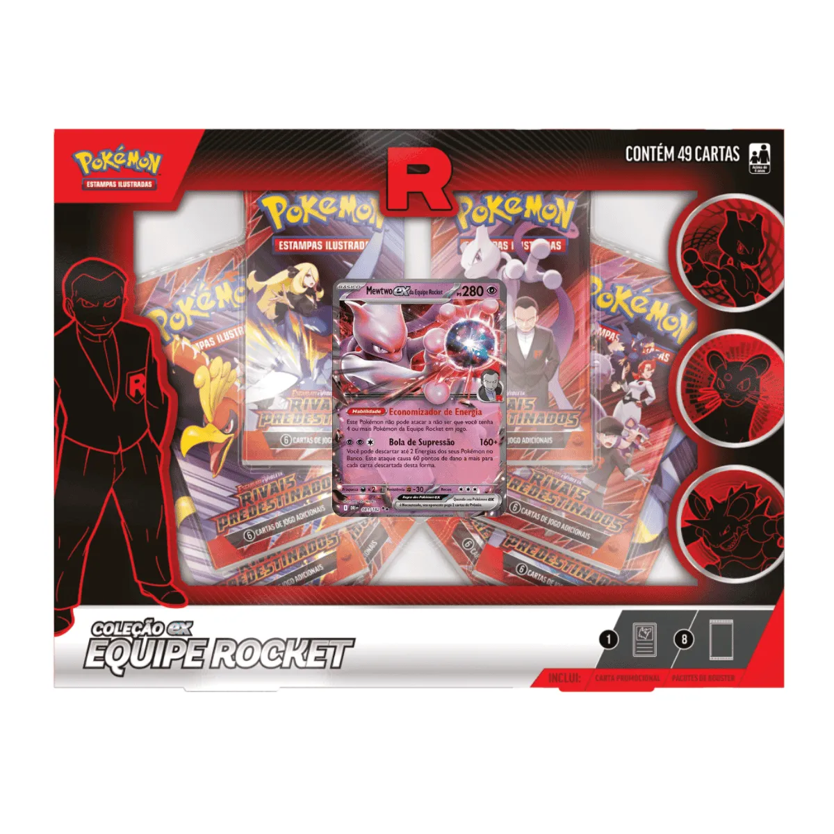 Concretize seus planos ambiciosos unindo-se aos Pokémon mais durões da Equipe Rocket! Escolha entre a mente estratégica de Mewtwo ex da Equipe Rocket, as toxinas potentes de Nidoking ex da Equipe Rocket ou o poder soberbo de Persian ex da Equipe Rocket, que aparecem nesta coleção como uma carta holográfica promocional, e descubra ainda mais cartas de Pokémon e de Treinador nos vários pacotes de booster.