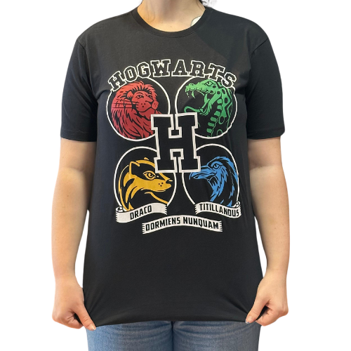 Esta peça clássica traz uma estampa vibrante com os brasões das quatro casas de Hogwarts: Grifinória, Sonserina, Corvinal e Lufa-Lufa, cada uma representando os valores únicos de coragem, ambição, sabedoria e lealdade.