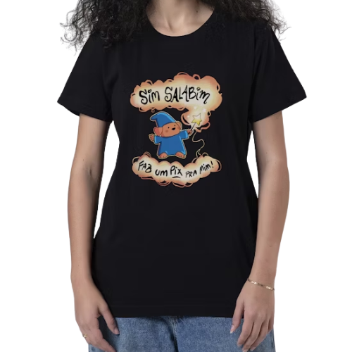 Com muito humor e um toque de magia, essa camiseta traz um simpático personagem vestido de mago, conjurando o feitiço mais atual do momento: “Sim Salabim, faz um Pix pra mim!”. Perfeita para quem gosta de estilo descontraído e quer arrancar risadas por onde passar.