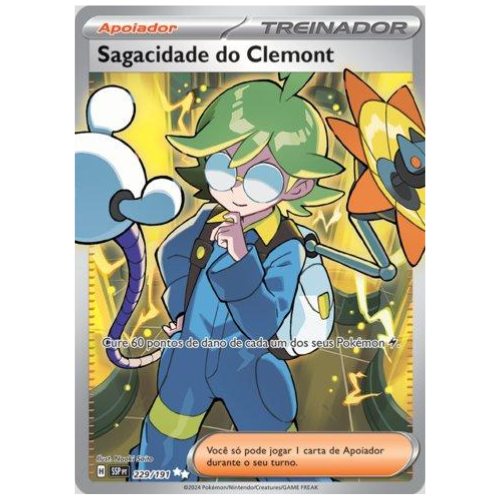 Suporte que traz o personagem Clemont em destaque, combinando estratégia e nostalgia.