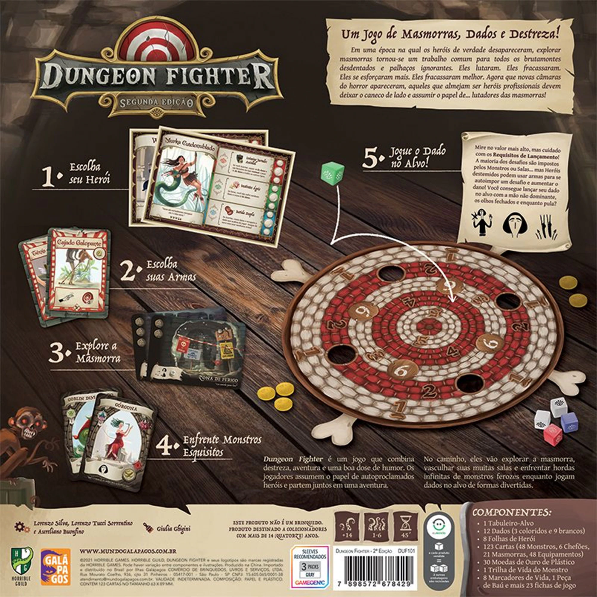 A 2ª edição de Dungeon Fighter traz de volta, 10 anos após seu lançamento original, um clássico Party Game que fez muito sucesso entre a galera! A essência do jogo segue a mesma: a boa e velha experiência de jogo cooperativo com seus lançamentos de dados divertidos e inusitados! Nessa nova edição o jogo foi aprimorado, contando com arte e design modernos, regras simplificadas, além de novidades como novos heróis, novas armas, novos monstros e muito mais. Mas não se engane – o jogo está tão desafiador como sempre! Combinando destreza, aventura e uma boa dose de bom humor, Dungeon Fighter (2ª Edição) é um ótimo jogo para lutadores destemidos que querem se divertir! No tabuleiro-alvo, os jogadores devem mirar e acertar dados no ponto certo para enfrentar as criaturas e saquear os tesouros. Mas não pensou que seria tão fácil, né? Para derrotar habilidades específicas de monstros, os jogadores podem lançar os dados com a mão não dominante, de olhos fechados ou até pulando – aumentando a dificuldade, mas também suas recompensas (seu ganancioso)!
