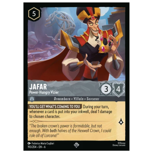 Com sorriso pérfido e cajado em punho, Jafar é envolto por chamas roxas e uma aura de manipulação.
