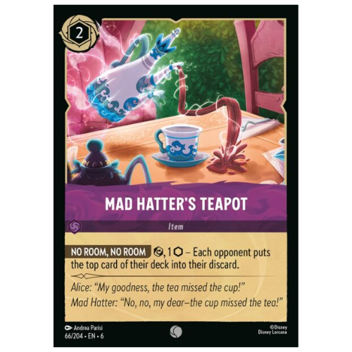 Colorida e absurda, a chaleira é cercada por vapor com forma de cartas e cogumelos, em um estilo caótico e encantador.