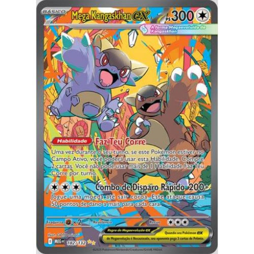 Kangaskhan com filhote em pose poderosa, arte vibrante e sensação de movimento heroico.
