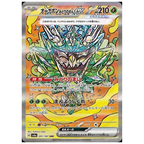 Forma EX do novo lendário Ogerpon com sua Máscara Turquesa, destacando sua força natural e energia mística. Carta de impacto visual e muito procurada entre colecionadores.
