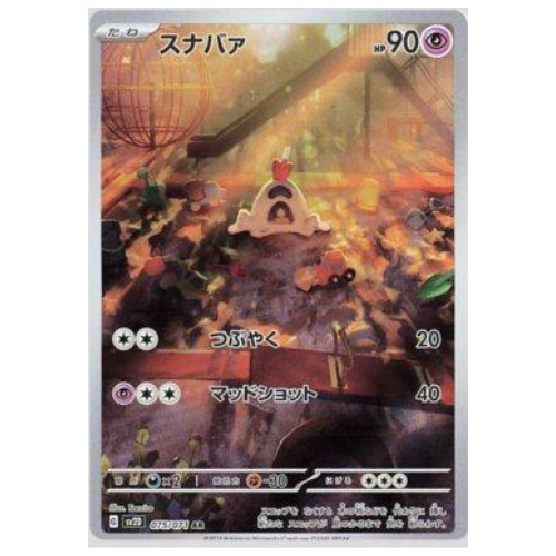 Pokémon fantasma e areia, com arte que une mistério e humor. Carta apreciada por sua estética única e temática de praia sombria.
