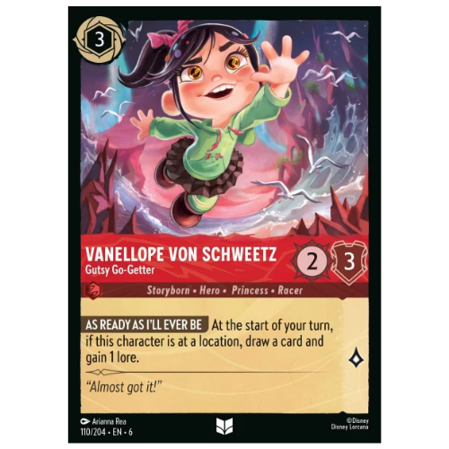Energia e cor explodem ao redor de Vanellope enquanto ela corre em sua pista doce, com expressão travessa.