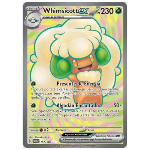 Pokémon de algodão em versão EX, com arte vibrante e encantadora. Carta de estilo alegre e criativo, valorizada por fãs de Pokémon fadas.